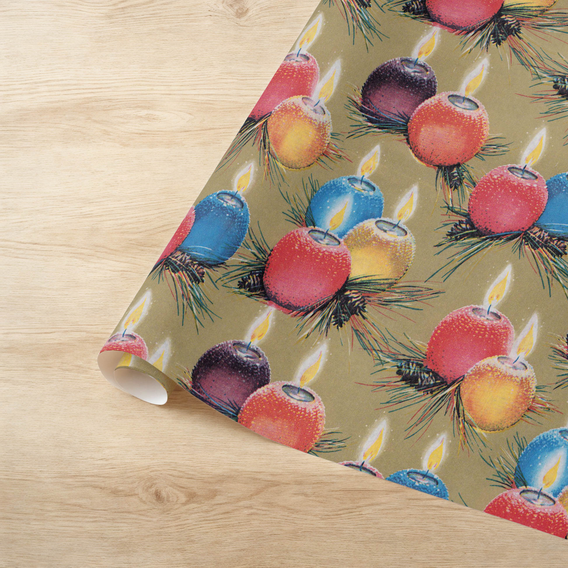 Ball candles nestled in pine on gold